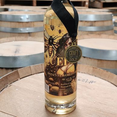 Using our triple distilled Oat Whiskey used to produce our Queen of Hearts Whiskey. We start with our 75% distillate and add local honey, from an apiary on the other side of town, bringing it to a warming 45%. The higher ABV starting point allows us to increase the intensity of the honey flavors while maintaining a dry finish unseen in other honey Whiskey. Think “Honey Nut Cheerios” but for adults.